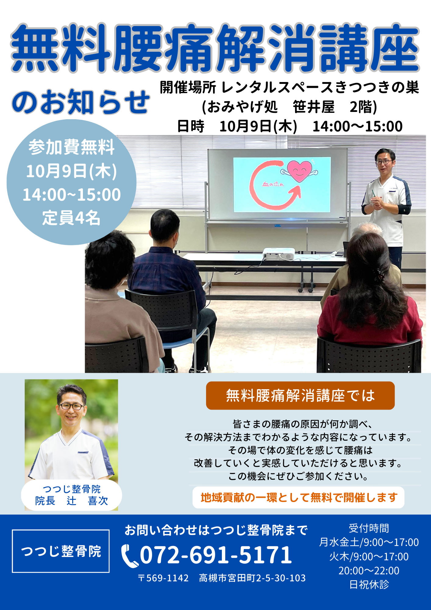 10月9日木曜日14時より、無料腰痛解消講座を開催いたします❕