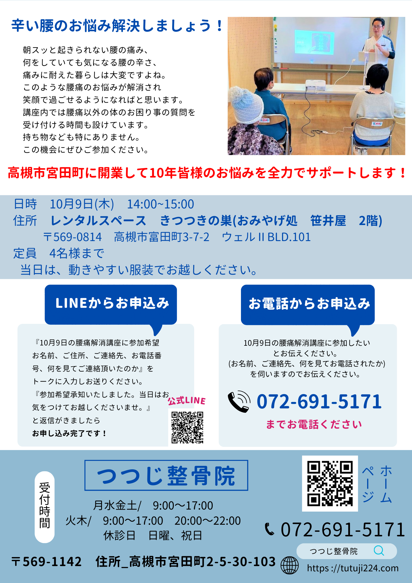 #高槻市 #摂津富田 #宮田町 #腰痛 #肩こり #坐骨神経痛 #整体 #つつじ整骨院 #腰痛解消講座