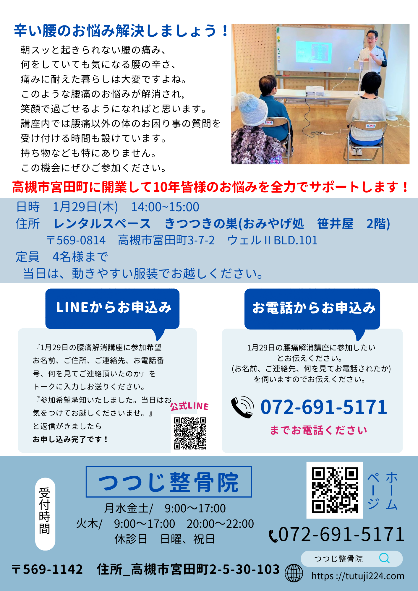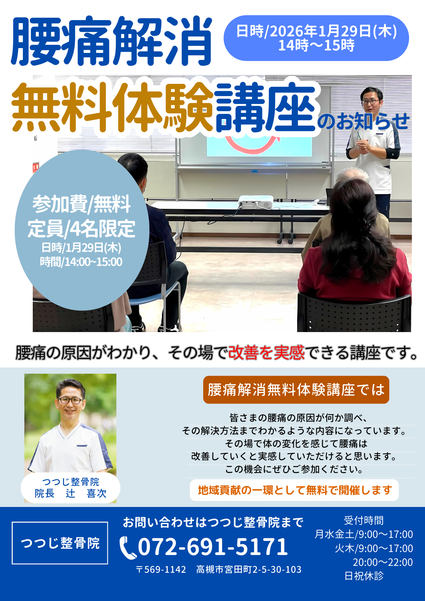 #高槻市 #摂津富田 #宮田町 #腰痛 #肩こり #坐骨神経痛 #整体 #つつじ整骨院 #腰痛解消講座 #無料体験講座